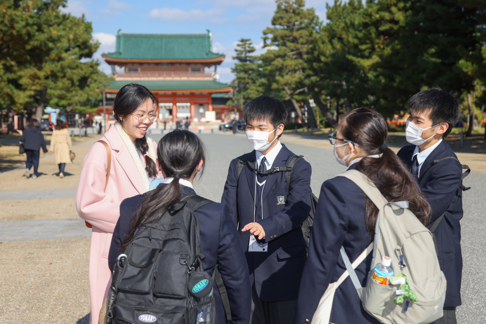 2日目は、京都での実践的な語学研修を実施しました。 各グループに留学生が一人ずつ加わり、京都の名所を巡りながら、設定されたミッションを英語でのコミュニケーションを通じてクリアしていくという内容です。 生徒たちは積極的に自分の考えを英語で共有し、議論を交わしていく中で、英語で意思疎通を図ることへの抵抗感が薄れたことでしょう。英語が単なる教科ではなく、身近なコミュニケーションツールとして感じられるようになった、実りの多い一日となりました。